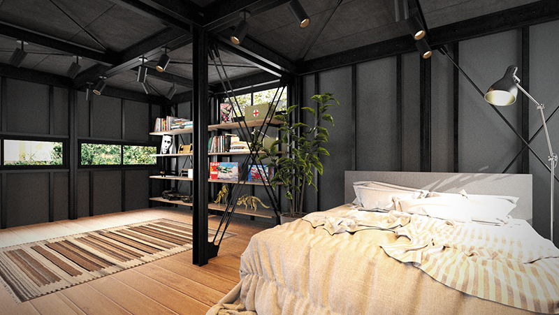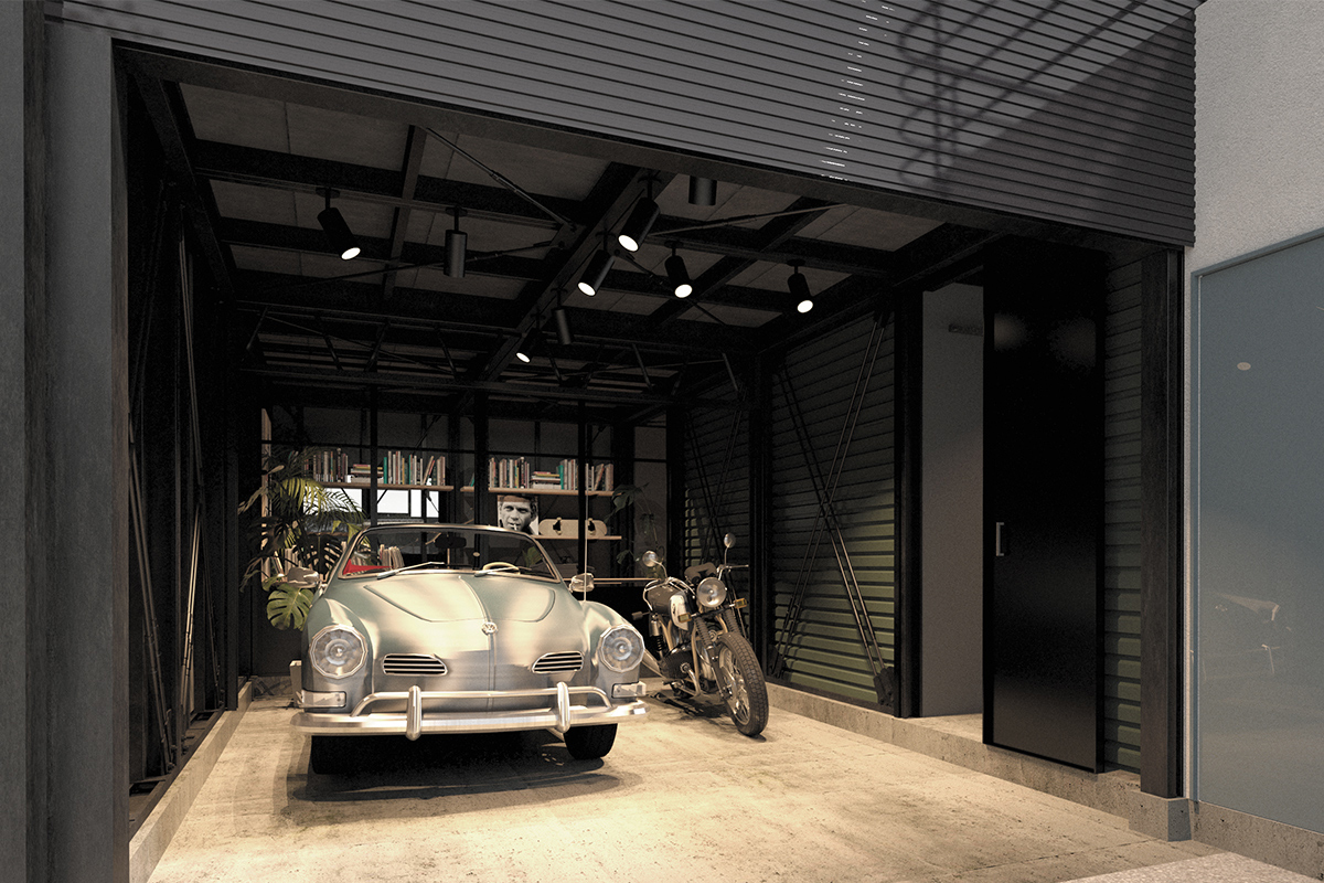 インナーガレージはツヤ消し黒の鉄骨のハードな空間の中に温かみのあるダウンライトを設置。