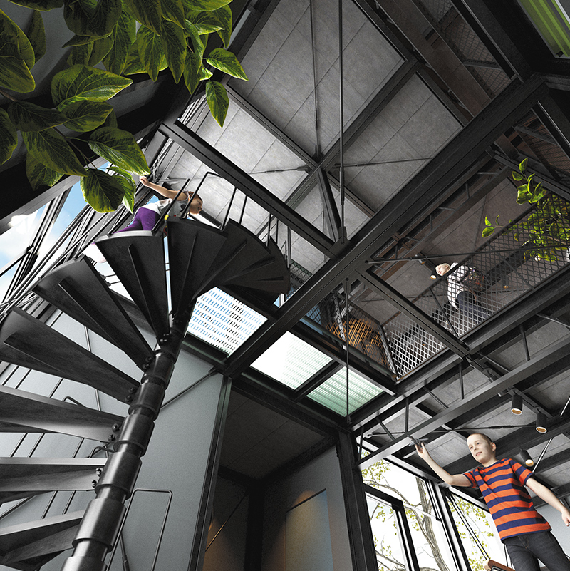 デイトナハウスオリジナルの鋼鉄製らせん階段『ダイナソーボーン』を中心に据えた開放的な一体空間が特長の『OPEN LIFE(OL)』。