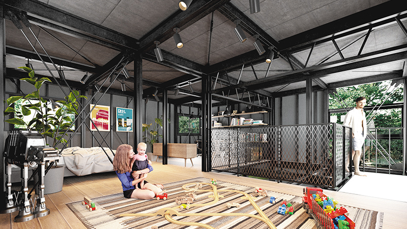 フルメタルのらせん階段やリビング空間にメリハリをもたらしてくれるトラス梁など、デイトナハウスならではの特徴的なエッセンスが満載です。